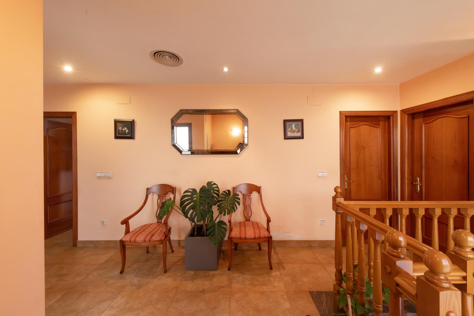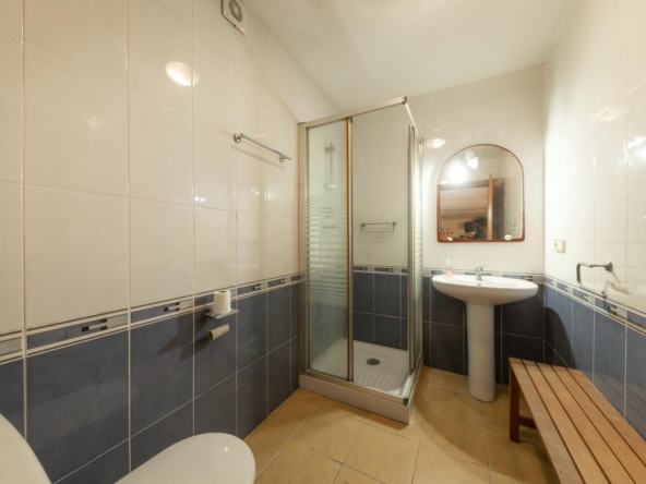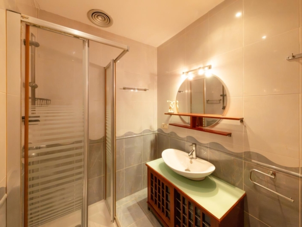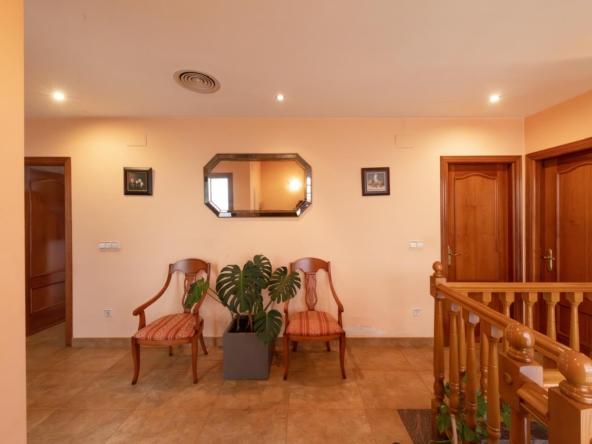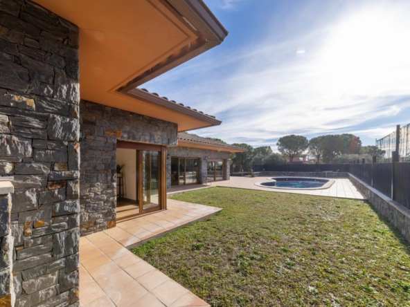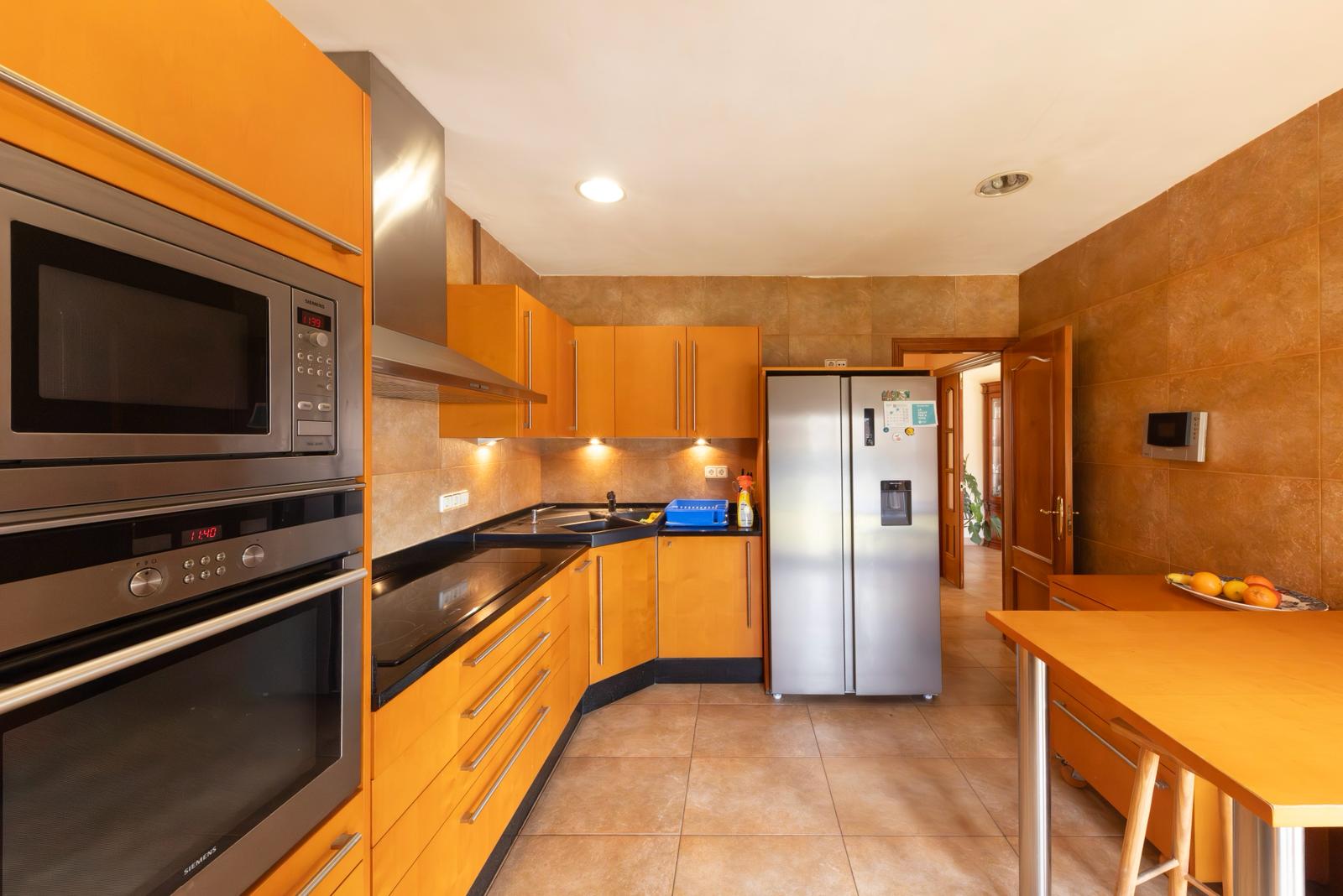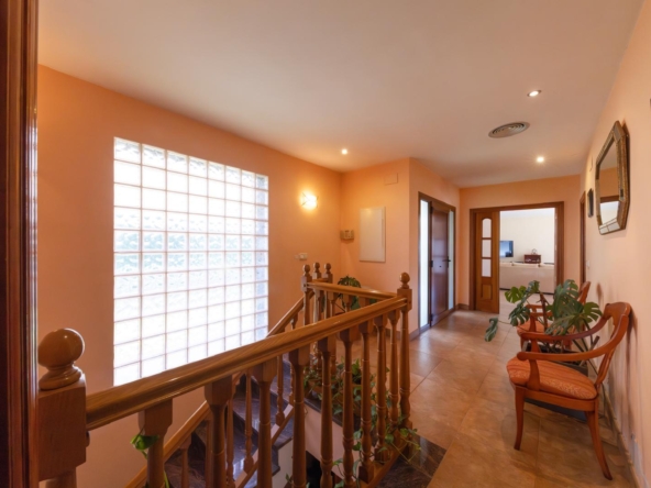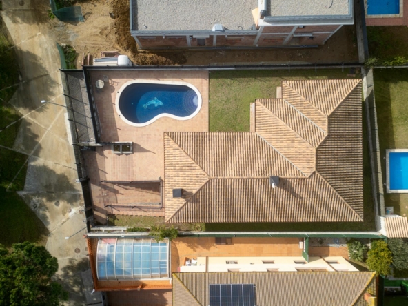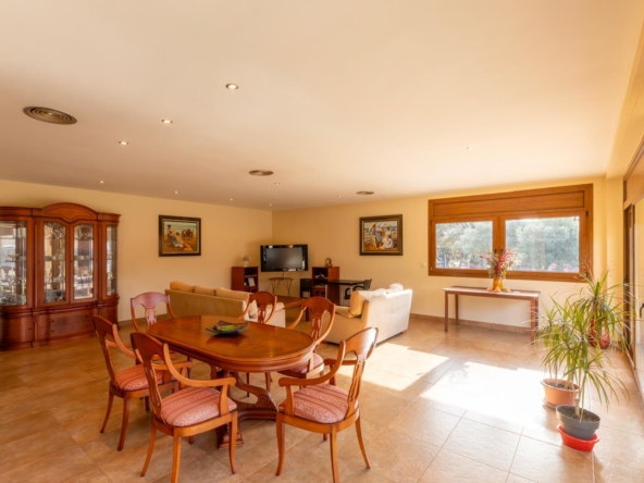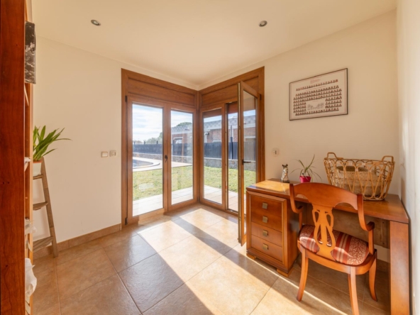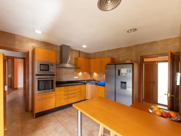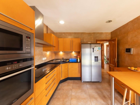La cocina independiente, totalmente equipada, es perfecta para los amantes de la gastronomía, mientras que el salón-comedor destaca por sus grandes ventanales panorámicos que inundan de luz natural el espacio. La propiedad cuenta con una terraza, un hermoso jardín y una refrescante piscina, ideales para relajarse y disfrutar del clima mediterráneo. Además, la escalera que conduce al garaje de 207 m² incluye un dormitorio con cuarto de baño, brindando opciones adicionales para huéspedes o familiares.