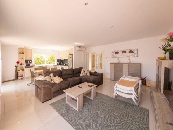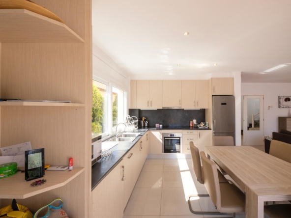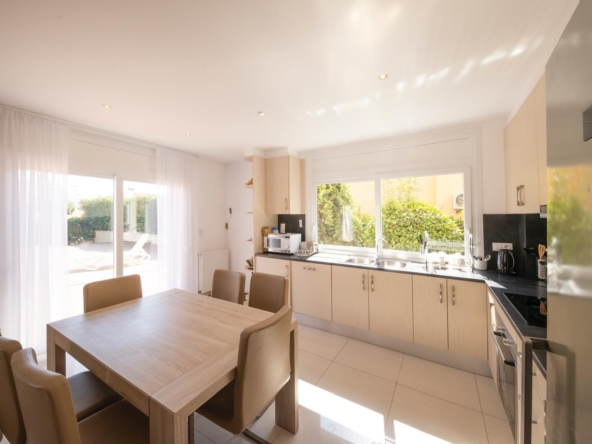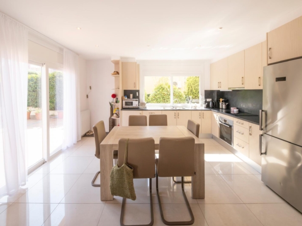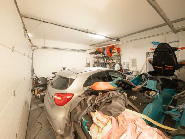 La casa impresiona por su amplia distribución. En la planta baja, encontramos una espaciosa entrada con acceso al salón-comedor con cocina americana contigua. Grandes ventanales panorámicos ofrecen vistas al jardín con terraza y piscina. El amarre también se encuentra aquí.